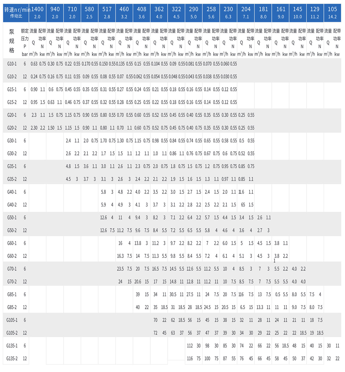 G系列螺杆泵性能参数